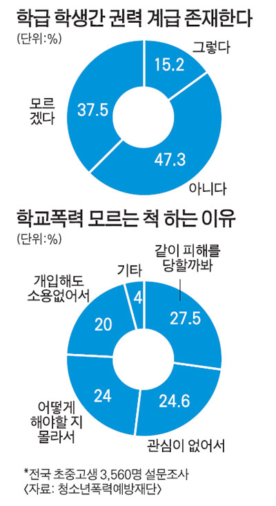 [진화하는 학교폭력] “당하는 애 도와주면 같은 취급 당해” “어떻게 아이들 사이에서 상위클래스 평민 찐따 종 등의 호칭이 오갈 수 있는지, 듣고도 믿을 수가 없었어요.” 서울 한 초등학교 교사 A(33)씨는 최근 담당 학급에 학생간 권력계급이 있다는 것을 듣고 가슴이 철렁했다. 한 학부모가 ‘자녀가 맞고 있다’는 학교폭력 신고를 접수했고, 이를 파악하는 과정에서 이런 사실을 알게 됐다. 가해자로 지목된 B군(11)은 여러 해 반장을 맡아 교사들 사이에서도 신뢰가 두터운 학생이었다. A교사가 사태파악에 나서자 아이들은 B군이 피해학생을 1년 넘게 때려왔고 ‘찐따’등으로 부르며 ‘종 부리듯’심부름을 시켜왔다고 고백했다. 자리 청소하기, 간식 사오기, 준비물과 교과서 빌려오기, 화장실에 따라와 휴지 들고 서있기 등 괴롭힌 정도가 심각했다. A교사를 더 경악시킨 것은 “걔는 원래 ‘찐따’라서 무시당해요”라며 폭력을 당연하게 받아들인 다수 학생들의 반응이었다. 학생들은 교실 안에 소위 상위급, 하위급 클래스라는 자신들의 분류가 존재한다고도 말했다. 상위급 클래스는 집안 환경과 교사의 인정을 바탕으로 학교폭력 가해학생들의 보호까지 받는 부류로 ‘1짱’이라 칭하고, 하위급 클래스는 약해 보이고 소심하고 행색이 추레한 아이들로 다수 학생들이 ‘찐따, 종’ 등의 호칭을 불러 무시한다는 것. 이렇다 보니 성적이 낮은 학생들이 주로 학교폭력 가해자가 된다는 옛 공식은 깨져있었다. “당하는 애가 불쌍하다고 말리거나 도와주면 같이 종 취급 받는다”는 말까지 듣고 나니 A교사는 작년부터 괴롭힘 당하는 학생을 보고만 있었던 많은 학생들의 행동이 이해됐다. 난감해진 A교사는 최근 ‘함께 살기 교육’등을 자주 하려 애쓰고 있다. 하지만 효과가 있는지는 아직 알 수 없다. 오지연 전국교직원노동조합 따돌림사회연구모임 사무국장은 “학생들에게 학급 권력관계를 그려보라 말하면 주로 가해학생을 정점으로 한 피라미드 구조를 그려낸다”며 “다수 학생들은 폭력상황을 방관하면서 함께 그 피라미드를 지탱하게 되는 셈”이라고 말했다. 권력 피라미드가 형성되는 까닭은 다양하다. 교사나 또래들에게 인정받고 싶은 욕망이 좌절된 학생들이 집단에서 무의식적으로 ‘제일 힘 센 애’, ‘남을 부려먹을 수 있는 애’등의 왜곡된 명예도 가지려 애쓰고, 자신도 모르게 권력 피라미드를 만든다는 해석이 지배적이다. 경제적 능력을 기준으로 한 성인들의 양극화를 본떴다는 해석도 있다. 오 국장은 “배려 우정 존중 등을 배울 수 있는 유일한 공간인 학교에서조차 학생들이 늘 남을 괴롭히고 무시하는 폭력 상황에 노출되고 있는 셈”이라며 “인성교육 등 생활교육에 대한 총체적인 보완이 절실하다”고 말했다. |