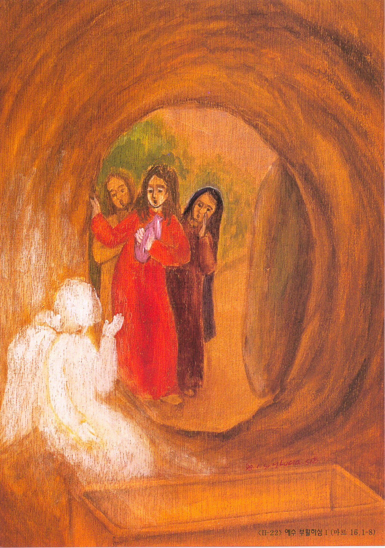 공관 복음서에 의하면 그녀는 무덤에 혼자 간 것이 아니라 야고보의 어머니 마리아와 살로메와 함께 무덤으로 향한 것 같습니다. 마르코(16,2)에 따르면 향료를 사느라고 시간에 늦은 여자들이 해가 떠오를 무렵에 무덤에 이릅니다. 그러나 막달라 마리아는 다른 여자들보다 앞서 왔습니다. 이 여인들은 서둘러서 치룬 예수님의 매장의 불완전함을 마무리하려고 향료를 들고 예수님을 찾아 왔던 것입니다.