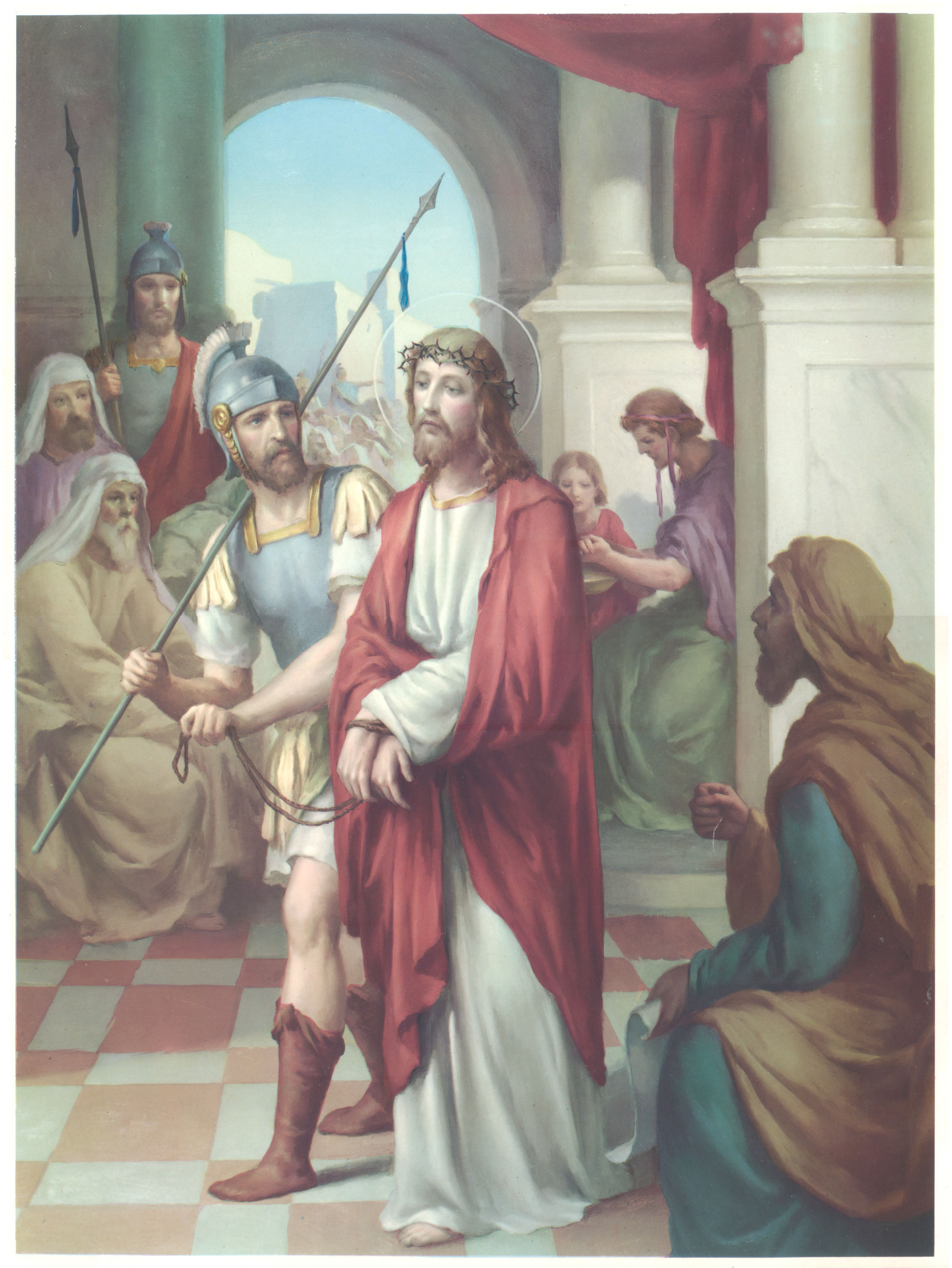 십자가형은 대역죄인이나 노예, 반란자등에게 내린 극형이었습니다. 채찍질은 동물의 뼈나 쇳조각 등이 부착된 가죽 끈이나 쇠사슬로 만들어진 것으로써 사형 언도를 받은 사람을 기진맥진하게 만들어 십자가의 고통을 훨씬 더 크게 만들어 못 견디게 하기 위해 가해졌습니다. 빌라도는 군중을 만족시키려고 바라빠를 풀어주고, 예수님을 채찍질하게 한 다음 십자가에 못 박으라고 넘겨주었습니다. 반란자는 풀려나고 무죄하신 예수님께서는 십자가의 길을 걷게 되십니다.