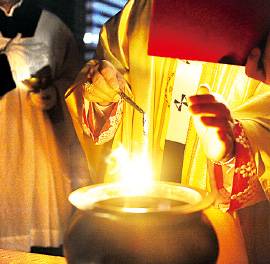 먼저 사제는 “그리스도께서는 어제도 오늘도, 시작이요 마침이요, 알파요 오메가이시며 시대도 세기도 주님의 것이오니 영광과 권능이 영원토록 주님께 있나이다. 아멘.”하고 기도합니다. 이 기도를 통해 예수님께서는 시작도 끝도 없으신 하느님이시며, 온 세상의 주님이심을 고백하며 마땅히 영광과 찬미를 드려야 함을 선포합니다.