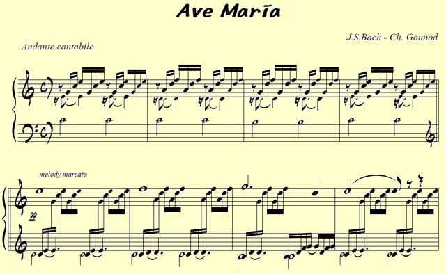 구노의 아베 마리아는 누구나 좋아하는 곡으로, 이 곡은 요한 제바스티안 바흐의 평균율 클라비어곡집 1권 BWV 846 중 전주곡 1번 다장조에 샤를 구노가 가락을 붙인 것입니다. 원곡을 구노 스스로가 발표한 적은 없는 것으로 보이지만, 구노의 생전에 무수한 편곡과 가사가 붙은 곡이 출판되었습니다.