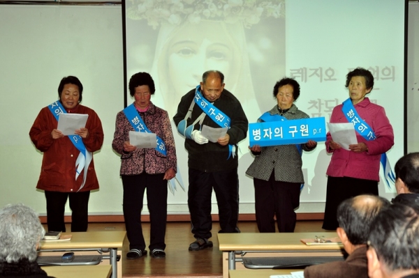 병자의 구원 단원들이 자신의 쁘레시디움 이름이 적혀 있는 어깨띠를 두르고, 자신들이 활동하고 있는 사진을 피켓으로 만들어 들고