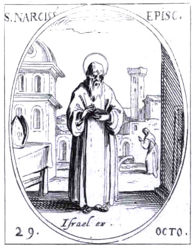 그리스인인 성 나르키수스(또는 나르치소)는 연만한 나이에 예루살렘의 주교로 임명되었지만, 어느 주교보다도 교구 내의 규율을 엄격히 실시하여 명성을 얻었지만, 예루살렘 회의에서 로마(Roma)의 관습들을 지지한 것 때문에 반대자들의 강력한 반란으로 주교좌를 물러나는 불운을 겪었다. 그 후 그는 몇 해 동안 사막의 은수자 생활을 하다가, 예루살렘 주민들의 강력한 요청에 따라 주교좌로 복귀하였고, 성 알렉산데르를 보조자로 임명했는데, 그 이유는 그의 나이가 116세였기 때문이라고 한다.
