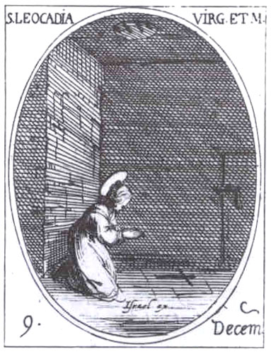 성녀 레오카디아는 에스파냐 톨레도의 귀족 집안의 딸로 태어났으나 디오클레티아누스 황제의 그리스도교 박해 때에 체포되어 투옥되었다. 감옥에서 그녀는 성녀 에우랄리아(Eulalia, 12월 10일)가 메리다(Merida)에서 순교했다는 소식을 듣고, 자신도 그녀를 본받아 그리스도를 위해 죽기를 소원하였다. 이리하여 그녀는 온갖 유혹을 물리치고 순교의 월계관을 쓰게 되었다. 그녀는 톨레도의 주요 수호성인으로 공경을 받고 있다.