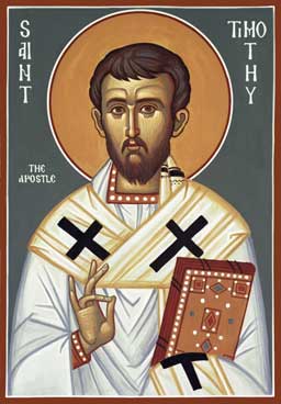 리카이니아(Lycaenia)의 리스트라(Lystra) 태생인 성 티모테우스(Timotheus, 또는 티모테오, 디모테오)는 그리스인 아버지와 유대교에서 개종한 에우니케(Eunice)의 아들이다. 그는 성 바오로(Paulus)가 리스트라에서 설교할 때 그의 제자가 되었으며, 그 후 성 바오로의 친구이자 오른팔 역할을 하였다(사도 16,1-4). 그는 혹시 말썽이 날까봐 할례를 받은 후 바오로의 제2차 전교 여행을 수행하였다.
