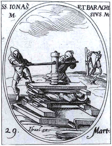 성 요나(Jonas)와 베릭예수(Beriksjesu) 또는 바라키시우스(Barachisius)로도 불리는 성 바로키시우스(또는 바로키시오)는 사사니아(Sassania)에서 사푸르 2세 왕의 박해 때에 순교하였다. 그들은 투옥된 그리스도인들을 격려하고 다니다가 체포되어 성 요나는 압착기에 눌려 죽었고, 성 바로키시우스는 화형을 당하였다.