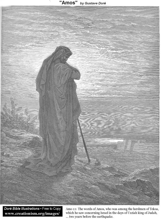 구약성서 열두 소예언서 가운데 세 번째 책인 아모스서의 저자인 성 아모스(Amos)는 정의의 예언자로서 예언-집필 문학 시대를 연 이스라엘 최초의 예언자였다. 아모스는 남부 유다 왕국의 수도 예루살렘(Jerusalem)으로부터 남동쪽으로 18km 떨어진 작은 촌락 드고아에서 태어났다(1,1). 다윗 왕권 계승 사화에도 등장하는(2사무 14,1-24) 이 마을은, 사방이 언덕으로 둘러싸인 유다 광야의 가장자리에 위치해 있어서 염소나 양 떼 목축업이 가능했던 지역이었다.