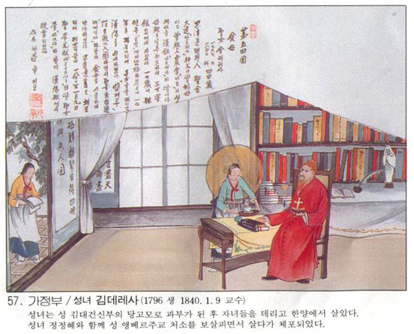 성녀 김 테레사(Teresia, 또는 데레사)는 충청도 면천 고을에 살던 김대건 신부의 당고모이다. 그녀의 조부 김진후 비오(Pius)는 1814년에 해미에서 순교했고, 부친인 김한현 안드레아(Andreas)는 1816년에 대구에서 순교했던 순교자의 후손이다. 그러므로 박해를 피하여 이리저리 피해 다녔기에 그녀가 어디서 태어났는지는 정확히 알 수가 없다고 한다. 어쨌든 그녀는 단아하고 자선심이 많은 처녀였다. 열일곱 살이 되어서 손연욱 요셉에게 출가하였는데, 단란한 생활 가운데서 여러 자녀를 낳아 모두 하느님을 경외하도록 교육을 시켰다.