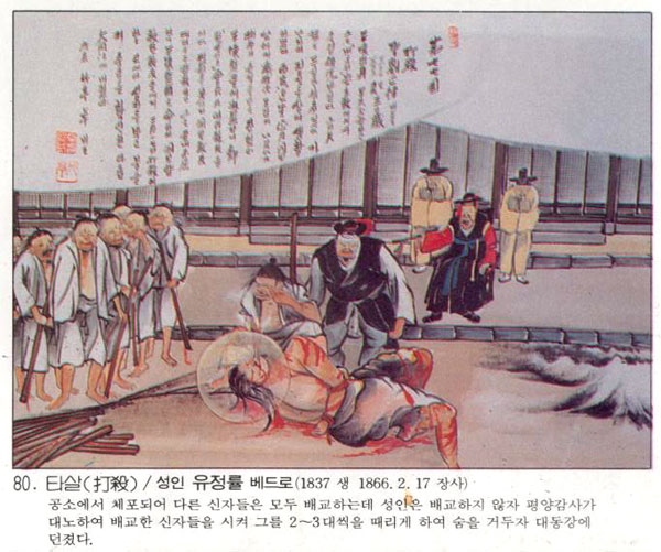 이윽고 문초가 시작되자 신자들은 한결같이 신앙을 고백하였으나, 심한 곤장을 맞고는 4명이 배교하고 유 베드로와 정 회장만이 남았다. 또 그 얼마 후 정 회장도 친구들과 배교자들을 따라 가니 결국 유 베드로 혼자 남게 되었다. 그러자 화가 치민 감사는 배교자들을 불러 들여 곤장을 주면서 유 베드로를 쳐 죽이라고 명을 내리니, 배교자들은 제 목숨을 건지기 위해 유 베드로를 치지 않을 수 없었다. 이때 유 베드로는 자기를 때리는 동료들에게 “살이 살을 잡아먹는구나.” 하면서 숨을 거두었다고 한다.