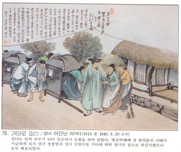 성녀 이간난 아가타는 서울의 어느 비신자 가정에서 태어났다. 열여덟 살 때 시집을 갔으나 3년 후에 남편을 잃고 과부가 되어 혼자 생활하였다. 1834년에야 비로소 천주교 이야기를 들은 후 그녀는 재가하라는 권고를 물리치고 신자들을 만나게 해달라고 어머니에게 간청하였다. 다행히 친척 중에 신자 한 명이 있어 쉽게 원을 풀 수 있었다. 이 친척이 아가타와 그 어머니와 오라비에게 천주교 교리를 설명하여 믿게 하였고, 유방제(劉方濟, 파치피코) 신부에게서 세례를 받게 해주었다.