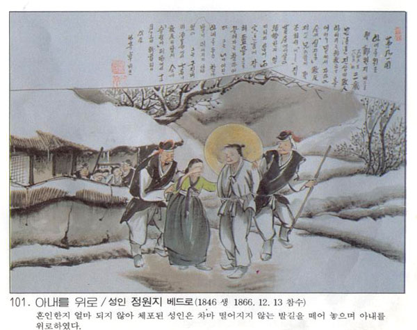 1866년 12월 3일 전라 감사가 보낸 포교와 포졸들이 성지동을 습격하자 정 베드로는 마을을 몰래 빠져나와 산에서 하룻밤을 꼬박 세운 뒤, 마을 일이 궁금하여 발몬이라는 마을 뒷산마루 아래만 살피면서 정신없이 내려오다가 산마루로 오르던 포졸과 정면으로 마주쳐 꼼짝없이 체포되었다. 그는 조 베드로 일행과 구진포리에서 하룻밤을 지낸 뒤 전주로 이송되어 심문을 받기 시작하였다.