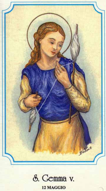 성녀 젬마는 농부의 딸로 태어났으나 부모의 깊은 신앙을 물려받으며 자랐다. 그녀는 주로 낮에는 양치기로 부모를 도왔으나, 밤에는 늘 기도하고 묵상하며 지냈다. 그러나 그녀의 미모가 뛰어났기에 12세 때부터 여러 가지 위험이 따랐는데, 특히 그 지방의 귀족이 그녀를 납치할 계획까지 세웠다. 이때 그녀는 하느님의 도움으로 먼 곳으로 피신하여 이탈리아 중부 아브르초(Abruzzo)의 술모나 교구에 속한 고리아노 시콜리(Goriano Sicoli)에 은둔소를 세우고 42년 동안 살았다. 이때부터 그녀의 높은 성덕이 사방으로 퍼져 나갔다. 그녀에 대한 공경은 1890년 교황 레오 13세(Leo XIII)에 의해 승인되었다.