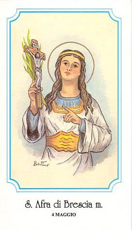 성녀 아프라는 이탈리아의 브레시아에서 순교하였다. 그녀는 브레시아 태생의 성 파우스티누스(Faustinus, 2월 15일)와 성 요비타(Jovita, 2월 15일) 형제 순교자와 관련이 있다고 한다. 그 외의 전설은 별로 신빙성이 없다.
