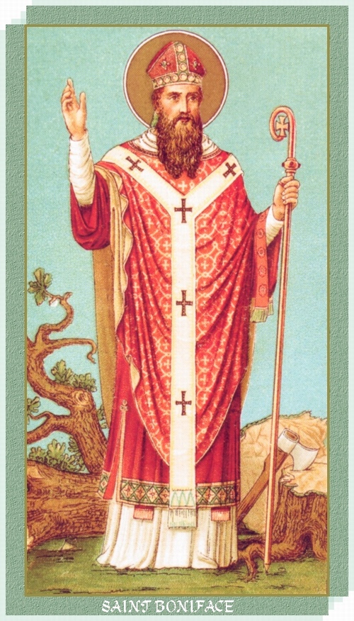 성 보니파티우스는 754년에 마인츠(Mainz)의 대주교직을 사임하고 성 빌리브로르두스의 사후 이방 관습에 다시 떨어진 프리슬란트를 재건하는데 여생을 바쳤다. 그가 프리슬란트의 도쿰(Dokkum) 근처 보르네 강변에서 개종자들에게 견진성사를 주려고 준비하던 중에 이교도들의 급습을 받아 살해되었다. \’게르만족의 사도\’ 또는 \’독일의 사도\’로 불리는 그의 축일은 교황 비오 9세(Pius IX)에 의해 1874년부터 전 교회에서 기념하고 있다.