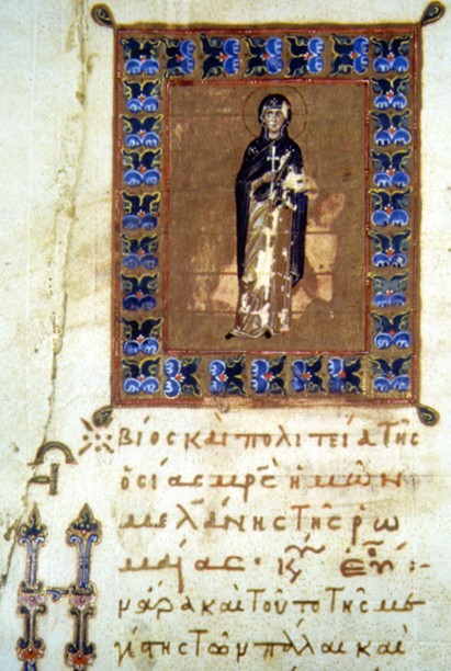성녀 멜라니아는 자선 사업가인 성녀 멜라니아(12월 31일)의 할머니이다. 22세 때에 과부가 된 그녀는 372년에 로마(Roma)를 떠나 팔레스티나(Palestina)로 갔으며, 여기서 성 히에로니무스(Hieronymus, 9월 30일)를 만나 그의 수도 공동체에 들어갔다. 그녀는 다소 강인한 여성이었으므로 손녀딸인 성녀 멜라니아와의 관계가 항상 좋은 편은 아니었다고 한다.
