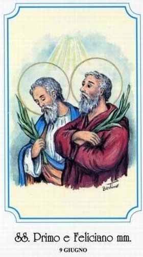 80세의 성 프리무스(또는 프리모)와 성 펠리키아누스(Felicianus)는 형제지간으로 로마의 귀족이었으나 그리스도인이 되어 자선활동을 하는 등 열심한 신앙생활을 하였다. 그들은 특히 감옥을 즐겨 방문하여 죄수들을 위하여 봉사하였다. 그러나 그리스도인이란 신분이 드러나게 되자 오랜 동안 피신해 있다가 결국은 체포되었다. 그들이 이교도의 신에게 희생 제사 드리기를 거부하자 즉시 투옥되어 매를 맞았으며, 관리들은 그들을 아주 천천히 죽이기 위하여 이리저리 끌고 다니다가 참수하였다고 한다. 640년 교황 테오도루스(Theodorus)가 그들의 유해를 산 스테파노 로톤도(San Stefano Rotondo)에 안장하였다.