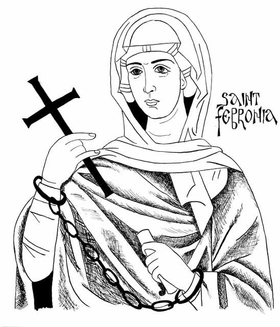 성녀 페브로니아는 메소포타미아(Mesopotamia)의 니시비스에서 살았으며 그 지방 최고의 미녀로 유명하였다. 디오클레티아누스 황제의 그리스도교 박해 때 지방 장관 셀레누스(Selenus)는 그녀가 만일 신앙을 포기하고 자기 조카 리시마쿠스(Lysimachus)와 결혼하면 석방하겠다고 달랬다. 그러나 리시마쿠스도 이미 신자가 되려고 마음을 먹기 시작한 줄 알고 그녀는 이 제안을 거부하였다. 이때부터 그녀에게 온갖 형태의 고문이 시작되어 마침내 죽게 되자 셀레누스는 거의 미친 사람이 되어 스스로 목숨을 끊었다고 한다. 이 사건 때문에 리시마쿠스와 수많은 부하들이 개종하고 세례를 받았으며, 이 소문은 삽시간에 울려 퍼졌다.